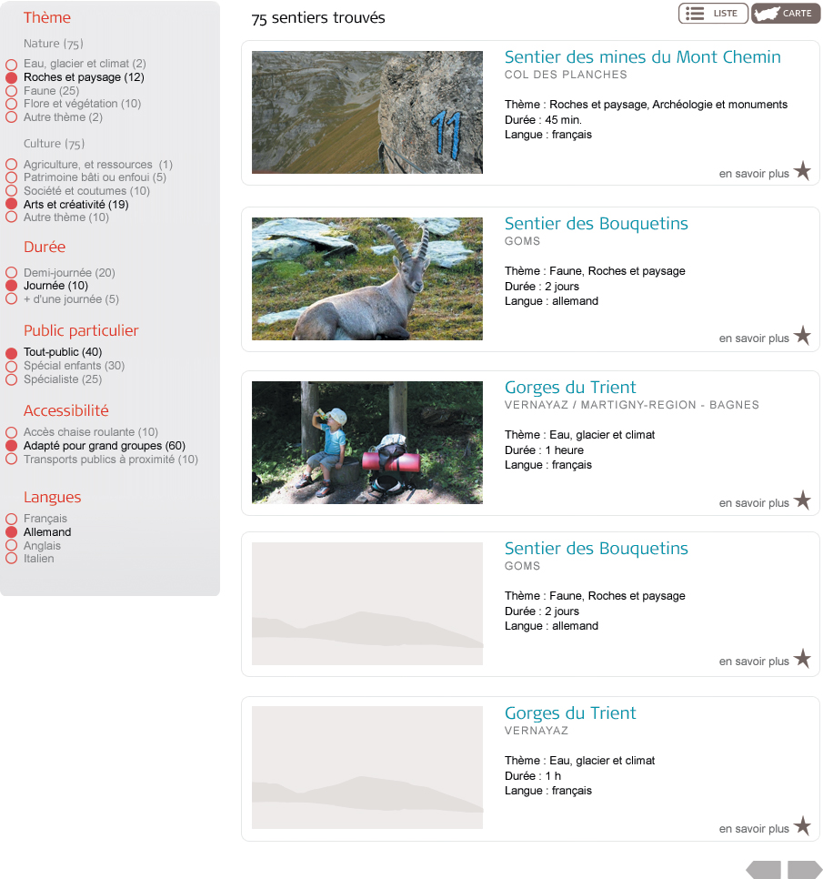 Le résultat s'affiche sous forme de carte ou de liste. Si le sentier de votre choix est classé comme sélectionné ou coup de cœur (informations complémentaires), cliquez dessus pour accéder à sa fiche détaillée.